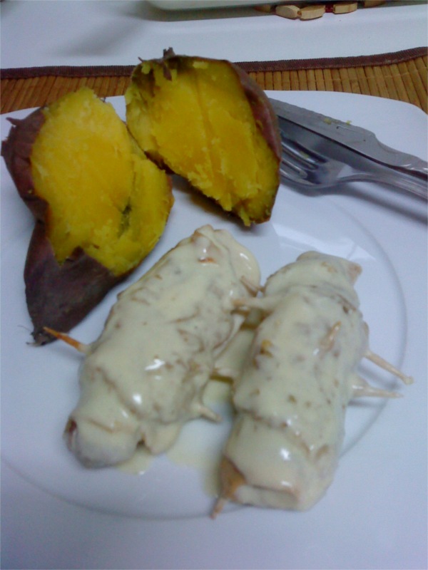 Eu acompanhei o meu com… batata doce assada! E pus a carne diretamente sobre uma fatia de pão. Hummm…. Estou viciada na batata doce!