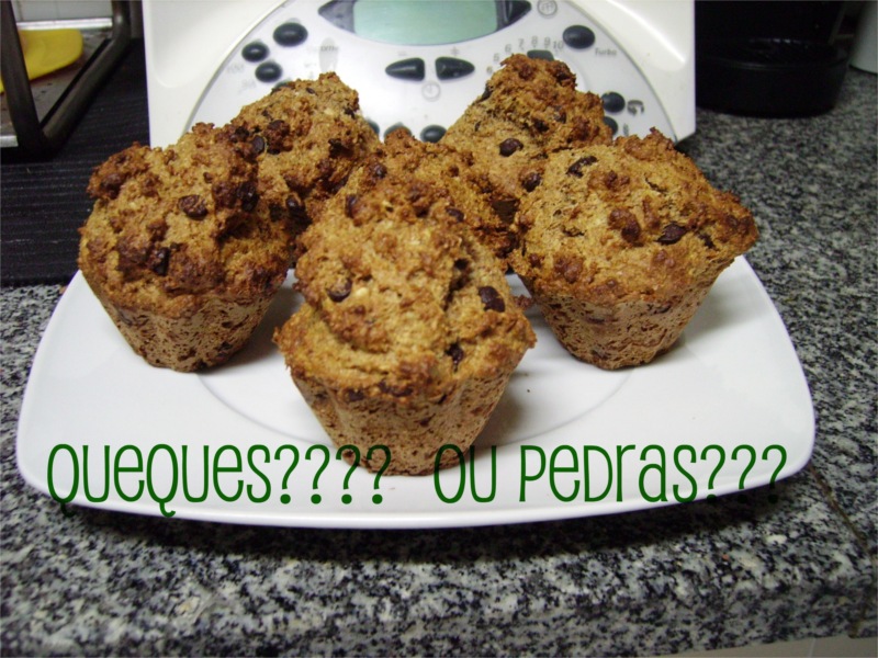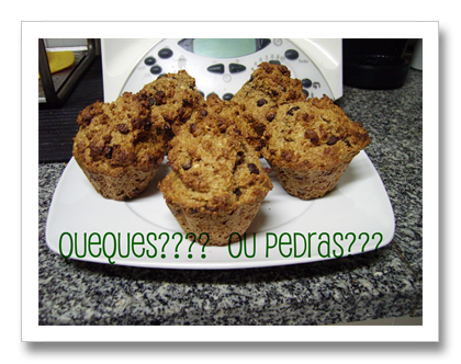 Estavam com aspecto de rochas, mas estão muito bons! E como achei que as pepitas ainda eram poucas, pus um bocado de doce no queque!