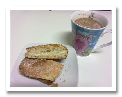 O pequeno almoço foi tomado em casa de mamãe: pãozinho com requeijão e café.