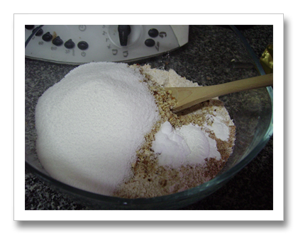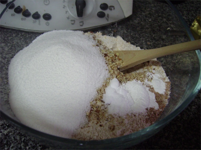 1. Numa taça, misturar a farinha e o farelo, a avelã, o bicarbonato de sódio, o fermento e o adoçante.