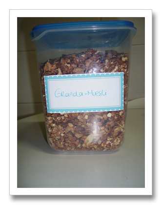 Para aproveitar o facto de ter o forno ligado num destes domingos, saiu também uma granola. A receita original é da Gasparzinha e eu adoro quer para pôr nos iogurtes quer para pôr por cima das papas de aveia (e muitas vezes para comer mesmo assim à gulosa…).