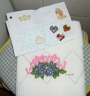 Recebi o presente da troca do Dia das Mães do Grupo Gráficos Ponto de Cruz. A minha amiga secreta foi a querida Animéri, de quem gosto muito, embora não a conheça pessoalmente. Adorei a toalhinha. Os coraçõezinhos são ímans.