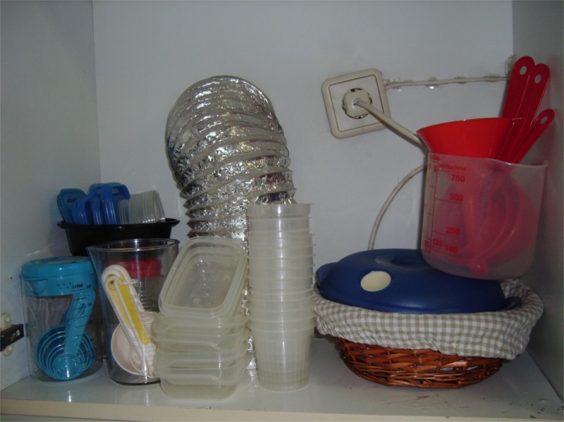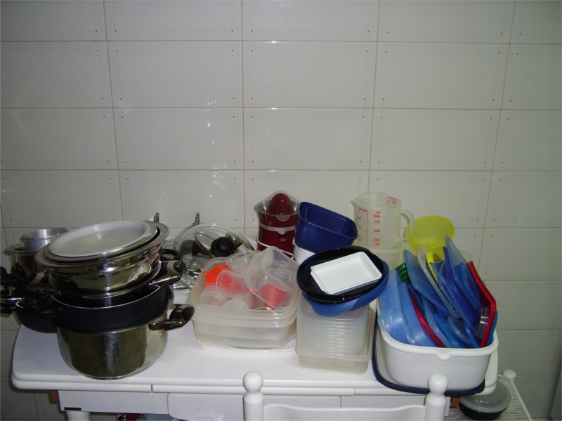 Terceiro passo: ver se existe alguma coisa partida, estragada ou que não se use. Analisar se há alguma peça que não seja usada habitualmente e que possa estar arrumada noutro local que não este. No meu caso, tirei deste armário o espremedor de laranjas e umas caixinhas pequeninas que não dá para guardar quase nada.