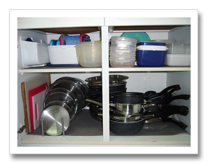 Tampas de tachos arrumadas em suporte próprio, tachos e frigideiras guardadas por tamanho, assim como as caixas plásticas. Também acabei por guardar as tábuas de cozinha neste armário.